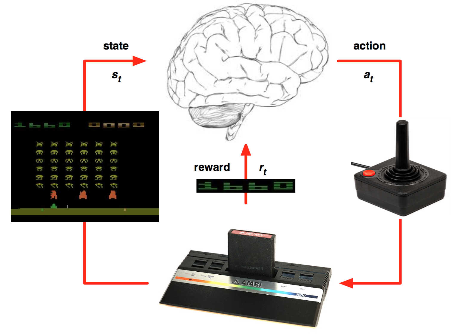 Playing atari with deep reinforcement learning 이라는 논문이 있습니다. 강화학습 + 딥러닝으로 atari라는 고전 게임을 학습시킨 것 입니다.