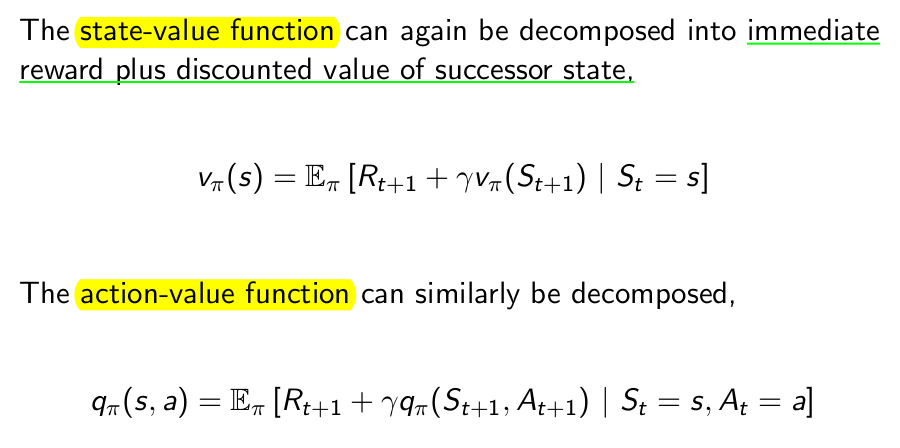 policy를 포함한 value function과 action value function도 Bellman equation의 형태로 아래와 같이 표현할 수 있습니다.