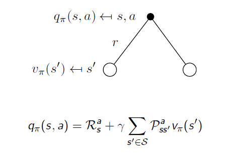 위 그림보다 추가된 것은 r인데 reward를 의미합니다. reward의 정의에 state와 action이 모두 조건으로 들어가기 때문에 그림에서 검은 점 밑에 표시된 것을 볼 수 있습니다. 또한 action에서 퍼져나가는 가지는 만약 deterministic한 환경이라면 하나의 가지일 것이나 앞에서도 말했듯이 외부적인 요인에 의해서(바람이 분다던지) 같은 state에서 같은 action을 해줘도 다른 state로 갈 수도 있습니다. 그러한 확률을 전에 언급했듯이 state transition probability matrix라고 합니다. action-value function은 imediate reward에다가 action을 취해 각 state로 갈 확률 곱하기 그 위치에서의 value function을(한 step이 지났으므로 discounted됩니다) 더한 것으로 표현할 수 있습니다.