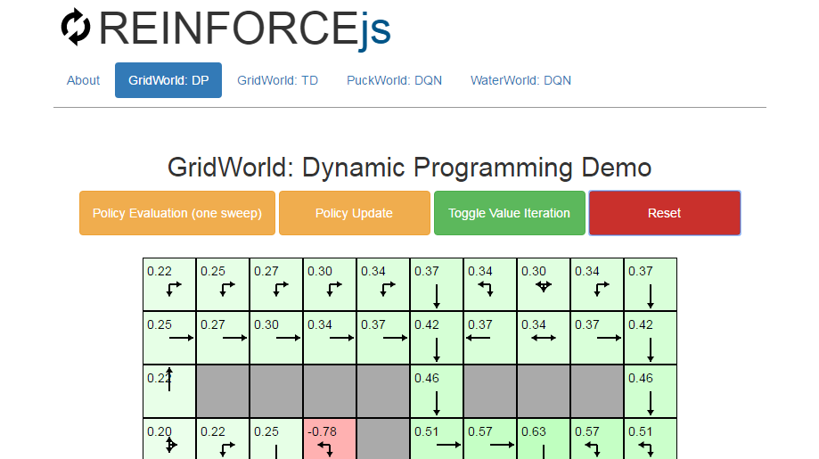 CS231n Convolutional Neural Network 강의로 유명한 Karpathy가 만든 사이트로서 자바스크립트로 위 예제보다는 더 큰 gridworld에서 dynamic programming의 과정을 볼 수 있도록 해놓았습니다. http://cs.stanford.edu/people/karpathy/reinforcejs/gridworld_dp.html
