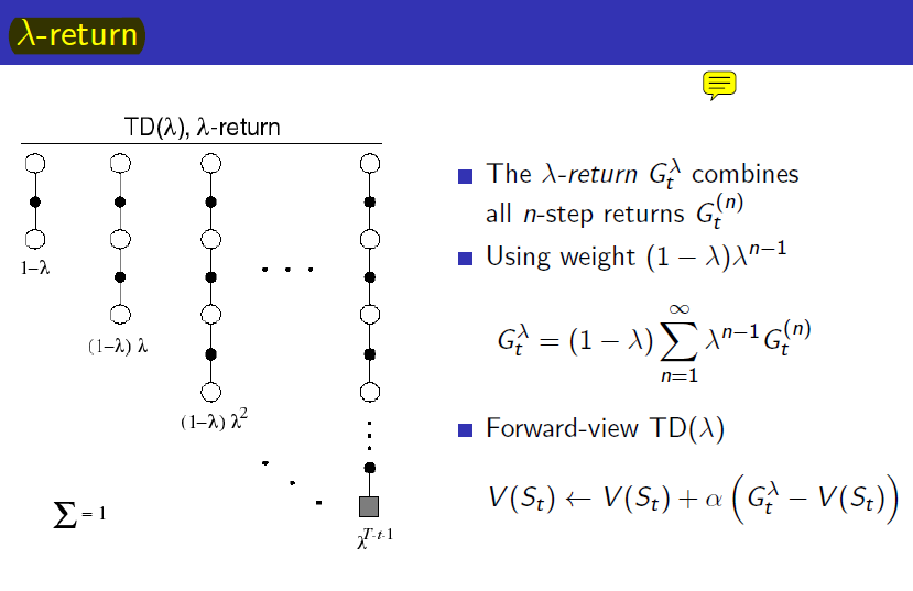 ๋ฐ๋ผ์ ์ด ๋ชจ๋ n-step return์ ๋ชจ๋ ๋ํด์ ์ฌ์ฉํ๊ธฐ๋ก ํ์์ต๋๋ค. ํ์ง๋ง ๋จ์ํ ๋ํด์ ํ๊ท ์ ๊ตฌํ๋ ๋ฐฉ์์ด ์๋๊ณ ์๋์ ๊ฐ์ด $$\lambda$$๋ผ๋ weight๋ฅผ ์ฌ์ฉํด์ geometrically weighted sum์ ์ด์ฉํฉ๋๋ค. ์ด๋ ๊ฒ ํ๋ฉด ๋ชจ๋ n-step์ ๋ค ํฌํจํ๋ฉด์ ๋ค ๋ํ๋ฉด 1์ด ๋์ต๋๋ค. ์ด๊ฒ์ ํตํด์ ๊ตฌํ $$\lambda$$-return์ ์๋ MC์ return์๋ฆฌ์ ๋ฃ์ด์ฃผ๋ฉด forward-view TD($$\lambda$$)๊ฐ ๋ฉ๋๋ค.