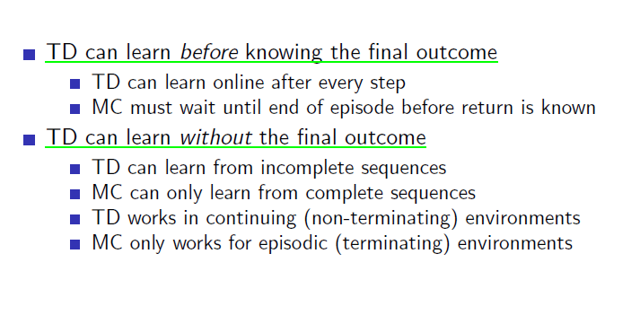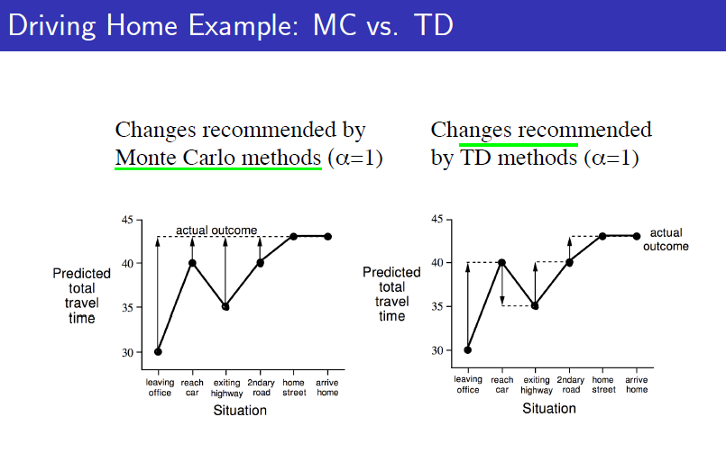 MC의 경우에는 다 도착한다음에 각각의 state에서 예측했던 value function과 실재로 받은 return을 비교해서 update를 하게됩니다. 하지만 TD에서는 한 스텝 진행을 하면 아직 도착을 하지 않아서 얼마가 걸릴지는 정확히 모르지만 한 스텝 동안 지났던 시간을 토대로 value function을 update합니다. 따라서 실재로 도착을 하지 않아도, final outcome을 모르더라고 학습할 수 있는 것이 TD의 장점이며 매 step마다 학습할 수 있다는 것도 장점입니다.